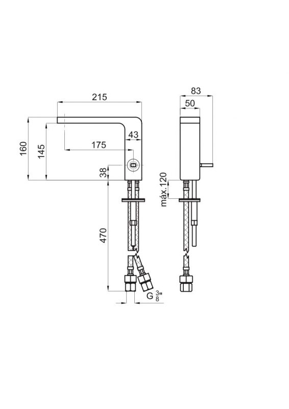 Однорычажный смеситель для раковины с керамическим картриджем Ø25mm. Связь 3/8”. Длина шлангов 470 мм., без клапана слива. Включает аэратор, внедренный в излив, который симулирует эффект каскадом, кроме того смеситель со стопором давления в 8 л/мин, чтобы предотвращать забрызгивание.